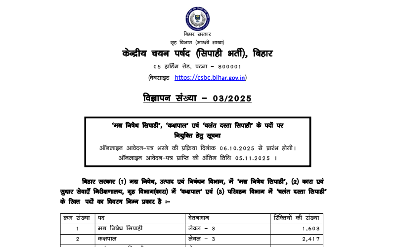यह भर्ती बिहार पुलिस विभिन्न पद भर्ती 2025 के अंतर्गत निकाली गई है। योग्य उम्मीदवार इस अवसर का लाभ उठाकर बिहार पुलिस विभाग में अपना करियर बना सकते हैं।